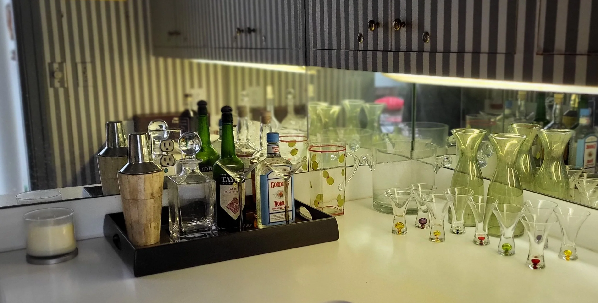 Wondering what to do with that glass decanter you found in the back of the cupboard and the martini glasses you never use? Why not create a cocktail tray a la Gatsby. I picked up the martini shaker at TJ Maxx years ago, back when I resolved to learn how to mix classic drinks. There’s still time to try my hand at that sherry martini. Meanwhile, I can enjoy a scene that draws me into the world Fitzgerald brought alive.